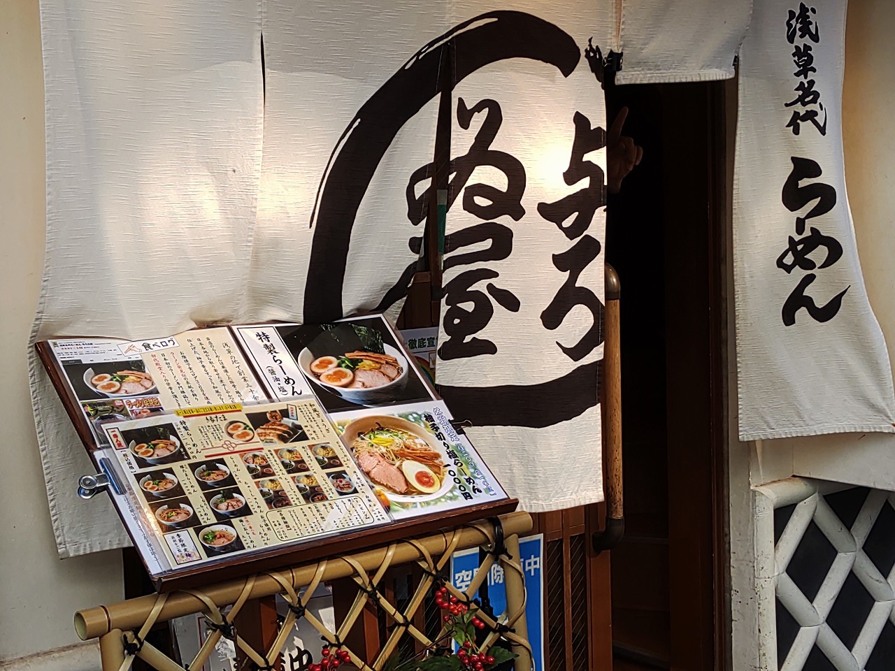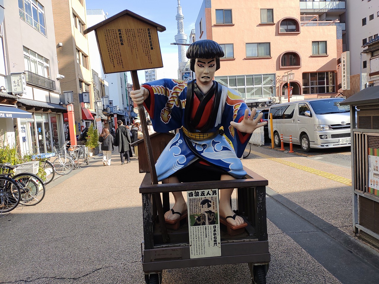 During the Edo period there were notable thieves. Their dolls are displayed on the street. The most famous ones were the five master thieves. The man striking a pose is their boss. The other four characters are seen or hidden somewhere. By the way, the ground floor of the building where the youngest thief is sitting on top is a ramen shop ‘Yoroiya’. It’s one of the best ramen restaurants in Asakusa. Why not look for the five thieves when you are there?