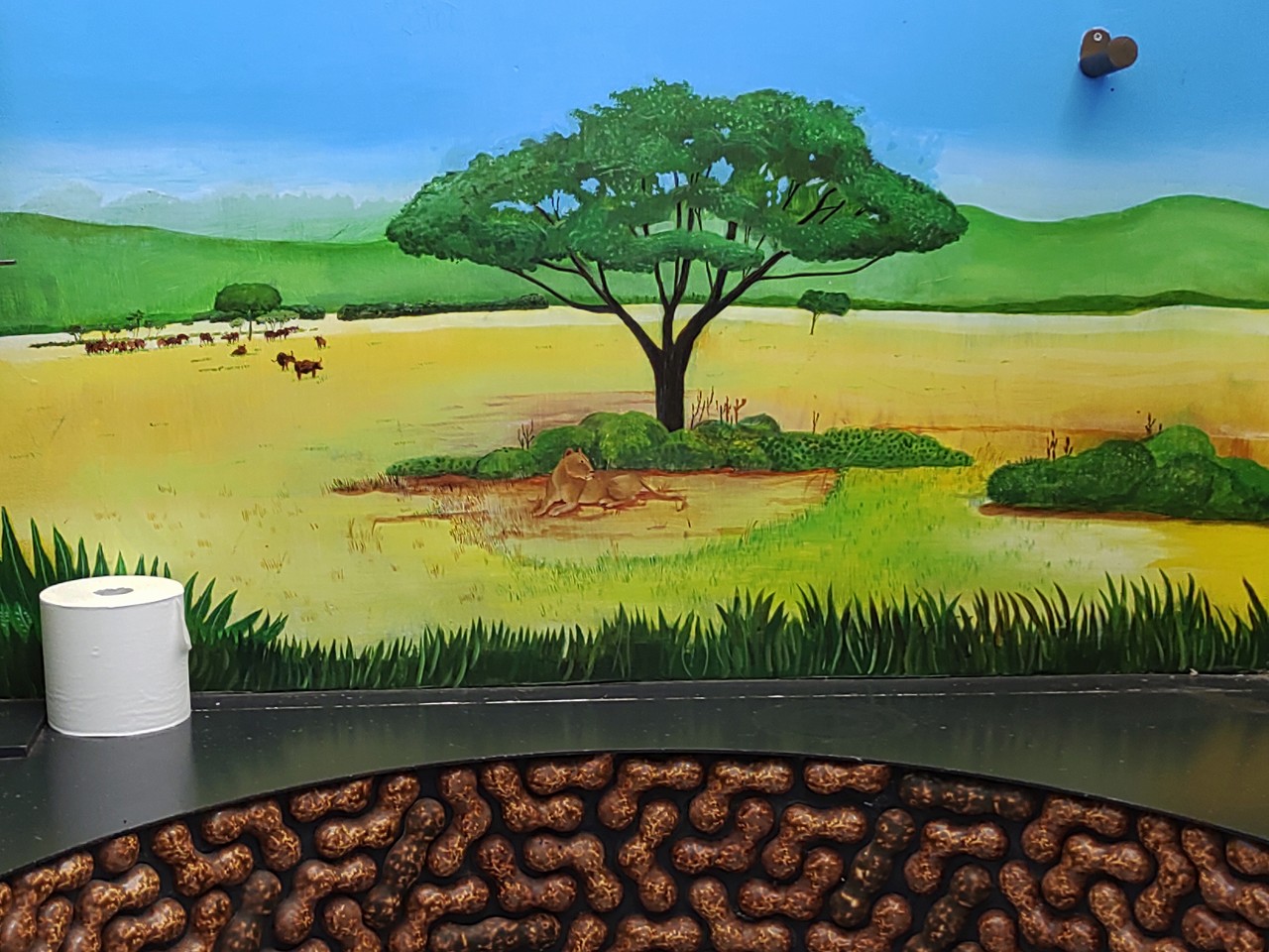 The restroom walls are covered with tiles shaped like poop. The stalls are designed to recall animals’ natural habitats. Different animals such as pandas, lions, giraffes, penguins, and birds are drawn. All of these works look realistic and have a very fine touch.