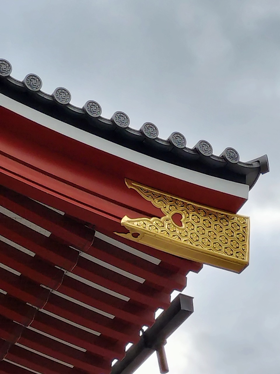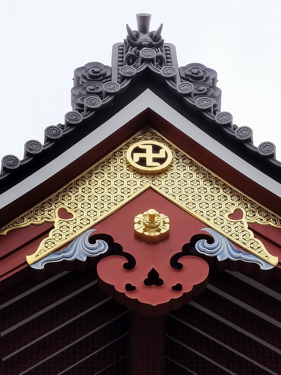 By the way, when you visit shrines or temples, you may see the shape of heart on the metal fittings etc. of shrines or temples buildings. Heart shape is generally used as the symbol of heart, mind or spirit and so on. In addition, it is also known that the shape of the heart is used as a pattern called “INOME” since ancient times in Japan. For example, it is known that a heart shape was used for the sword guard in the 6th century. The heart shape has been used long before Japan came into contact with Western culture. “INOME” means boar’s eye. The eyes of the wild boar look like the shape of a heart. Literally “INOME” is named after the shape of boar’s eye. For example, as the picture shown below, you can see heart shape on the metal parts of the roofs or gates of temples or shrines buildings. This decoration with the heart shape is called “INOME”. “INOME” is said to have been used as a talisman against evil spirit and to protect the buildings from fire since ancient times.