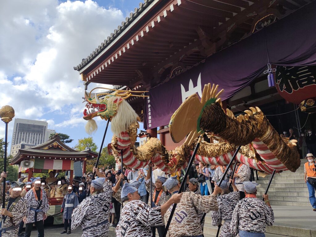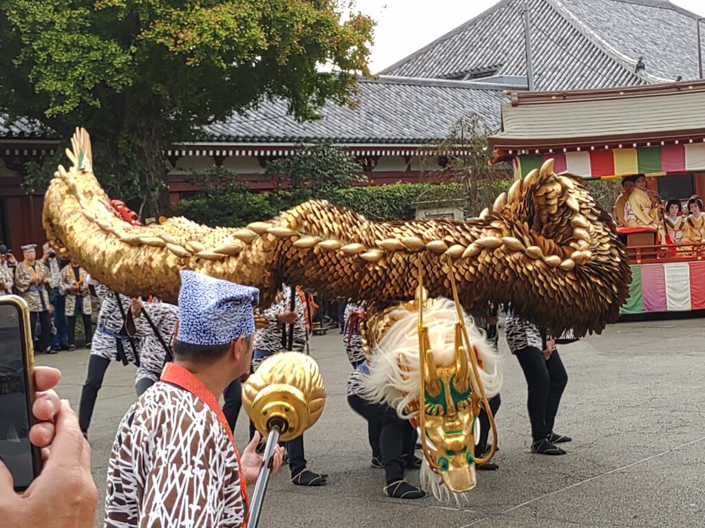 The Golden Dragon Dance was first performed in 1958 to commemorate the reconstruction of the main hall of the Sensoji Temple. The origin of this performance is associated with the Temple’s foundation. The Kannon statue which represents Sensoji Temple’s main image, was taken from the Sumida River in 628, roughly 1,400 years ago. Since then, a golden dragon has been protecting it according to legend.