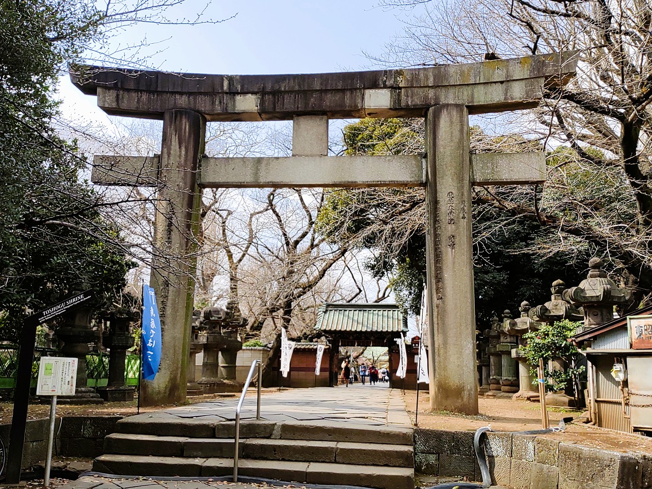 The traditional five-story pagoda is seen beyond the fence. It has been standing for about 380 years. The wooden pagoda originally belonged to the Toshogu shrine but is now the property of the Tokyo Metropolitan Government and located in the Ueno Zoo. It’s one of 22 five-story pagodas which were built by the end of the Edo period. There are two such five-story pagodas in Tokyo and this is one of them. The tower looks nice from the shrine grounds.