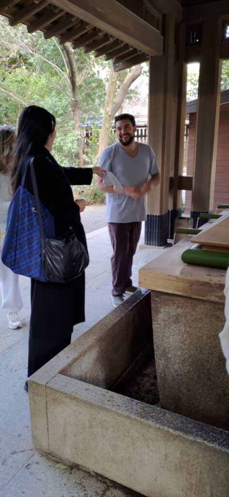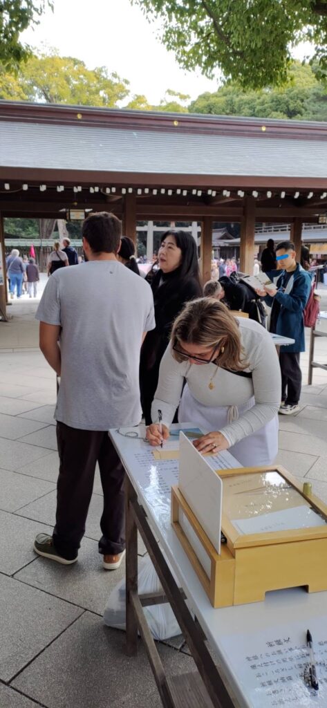 We are so delighted that you showed interest in Japanese traditions and proactively experienced them, such as washing hands and mouth at the temizu-ya, shrine worship, writing a letter to the deity, and Waka poems composed by Emperor Meiji and Empress Shoken.
